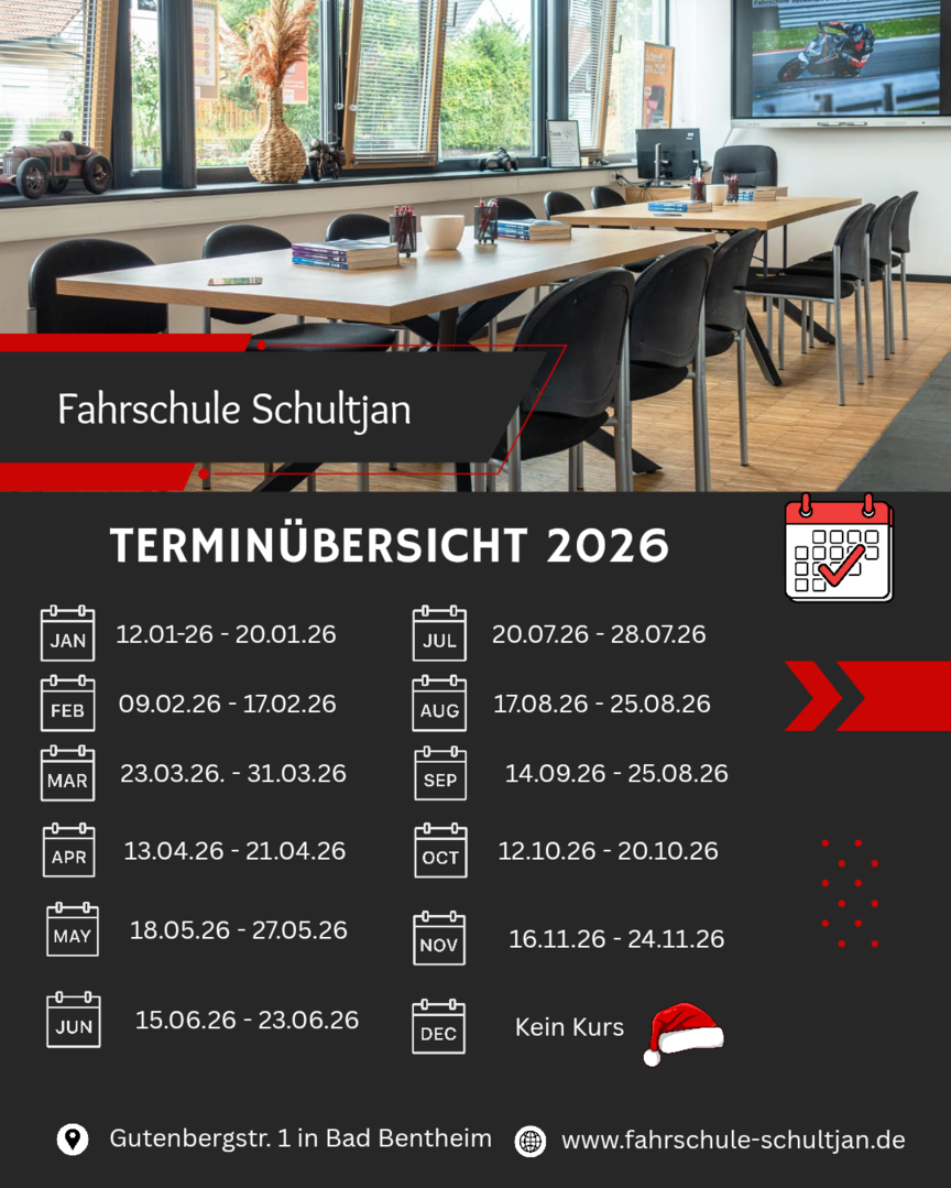 | Für ein persönliches Beratungsgespräch kontaktieren Sie uns ganz einfach unter Tel. 059228194499. Handy: 01773410021. Gerne auch per WhatsApp oder SMS oder EMAIL unter fahrschule-schultjan@gmx.de | |